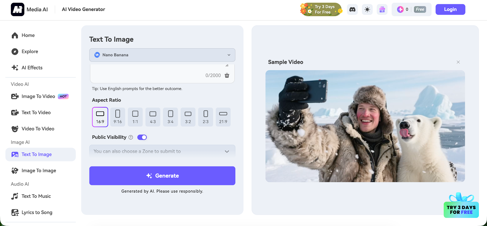 Click ‘Generate’ to instantly create your images. From there, you can utilize the platform’s comprehensive editing tools for tweaks or proceed directly to the Image-to-Video feature to turn your still art into a dynamic animation, complete with background music.